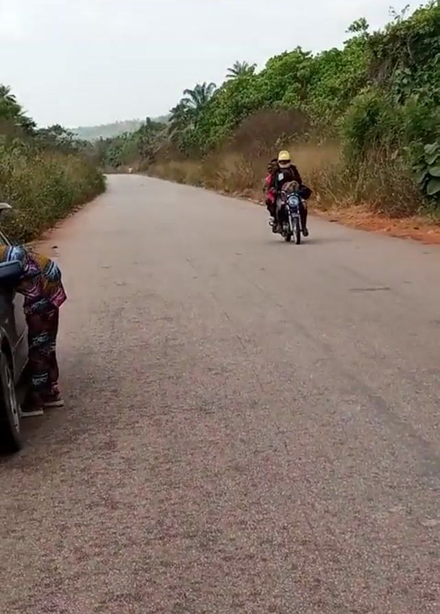 grey asphalt road with green vegetation on either side. A motorcycle with three people on it rides down the road. The person driving is wearing a yellow helmet, and one of the passengers is wearing a backpack. A blue car is parked off the side of the road. Someone standing by the open car door watches the motorcycle pass.