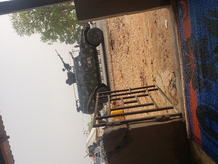 The image depicts an outdoor scene in Adankolo, Nigeria, viewed from inside a structure through an open doorway. A blue and orange patterned floor mat occupies the lower foreground, leading to a dark metal gate hinged to a concrete wall on the left. Beyond the doorway, a reddish-brown dirt or gravel expanse transitions to a paved road. On this road, a large, dark green camouflage armored vehicle, marked "CA4" in white, is prominently positioned. The vehicle is fitted with multiple weapons on its roof, including a forward-facing heavy machine gun on a turret. To the left and slightly behind, a second, partially obscured camouflaged vehicle is visible. A yellow cylindrical object rests on the dirt ground between the vantage point and the primary armored vehicle. The background features a hazy sky, the upper canopy of a large green tree on the right, and distant structures including utility poles and wires. No individuals are explicitly visible.