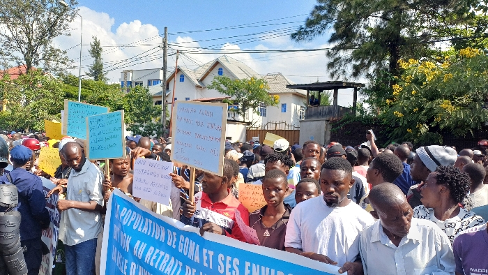 The scene depicts a dense crowd of individuals engaged in an outdoor protest or demonstration in the city of Kabinzi, Rwanda. The foreground features numerous people, predominantly adults and some youth, standing closely together. Several individuals hold handwritten signs of various colors, including light blue, white, and yellow, displaying text in what appears to be a local language. A large blue and white banner, partially visible, stretches across the lower portion of the image, with French text reading "POPULATION DE GOMA ET SES ENVIRO[NS]" and "DU RWK AU RETRAIT DE..." suggesting a focus on the population of Goma and withdrawal related to Rwanda. On the far left, at least two individuals in dark blue uniforms, helmets, and protective gear, consistent with law enforcement, are visible. The crowd is diverse in age and attire, with many looking towards the front of the gathering. In the background, under a partly cloudy blue sky, multiple two-story buildings with light-colored facades, pitched gray roofs, and blue-framed windows are visible. Lush green trees and shrubs, some bearing yellow flowers, line the street and properties. A dark wooden structure, possibly a guard post or observation deck, stands above a wall on the right side of the image. Overhead utility lines are present across the sky. The overall environment suggests an urban or semi-urban setting during daylight hours.
