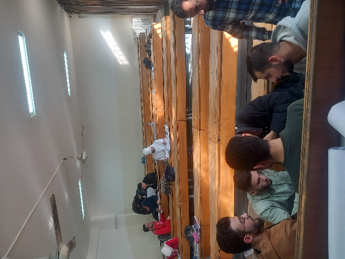 The image displays an indoor scene within a lecture hall or classroom located in Al-Qanawat Municipality, Syria. Approximately 10-12 males, primarily young adults, are present. The room features tiered wooden desks and benches, light-colored walls, a white ceiling with multiple rectangular fluorescent light fixtures, and two white ceiling fans. Natural light enters from the right side of the frame, creating illuminated streaks on the wooden seating and a radiator unit positioned along the far right wall. In the immediate foreground, a group of six males is visible at a lower tier. Three are seated, looking downward at the desk surface, indicating engagement with materials or discussion. These include an individual wearing a brown hoodie and glasses, another in a light green hoodie, and a third in a dark green shirt seen from behind. To their right, a male in a black padded jacket leans forward, and another in a light gray hoodie looks to his left. A male in a blue and white plaid shirt stands to the right of this seated group, facing them. In the mid-ground, a lone male in a white hoodie and white cap is seated at a higher tier, focused on papers spread on his desk, with a clear plastic bottle positioned beside him. Further to the left in the mid-ground, three additional males are seated at a desk, appearing to be working individually or in a small group. One wears a red long-sleeved shirt, and a red notebook is visible on his desk. A dark backpack is situated on the floor beneath a desk in this section. All visible individuals are engaged in activities consistent with a study or educational environment.
