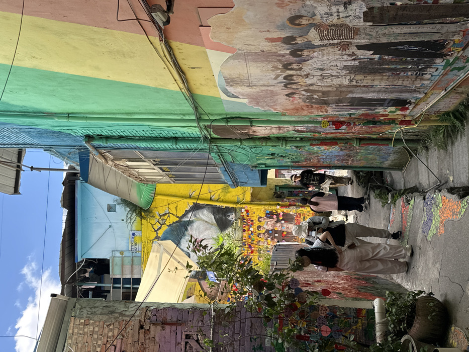 The image depicts a narrow urban alleyway in Shapingba District, China, illuminated by daylight under a blue sky with scattered clouds. The walls of the multi-story buildings lining the alley are extensively covered in vibrant murals and paint. The left wall features exposed red brick at the lower portion, transitioning to a surface adorned with numerous small, colorful, possibly heart-shaped decorations. Further along this wall, a large yellow mural portrays an animal's head, possibly a cat or fox, with a cracked ground effect, positioned above a mural depicting a group of multiple individuals. An off-white fabric awning extends from the left building over a section of the pathway. The right wall is painted with vertical stripes of green, yellow, and peach/pink, overlaid with a large mural of seven young men, partially covered by signatures and graffiti. Green utility pipes and black electrical wires are affixed to this wall. The concrete pathway features inlaid sections of colorful mosaic tiles. Five individuals are present: two in the foreground on the left, one wearing light wide-leg pants and the other a white bucket hat while holding a phone; two individuals are further back, walking away from the camera; and one person is partially visible in the background near the left mural. Potted plants are situated on the ground in the lower left foreground.