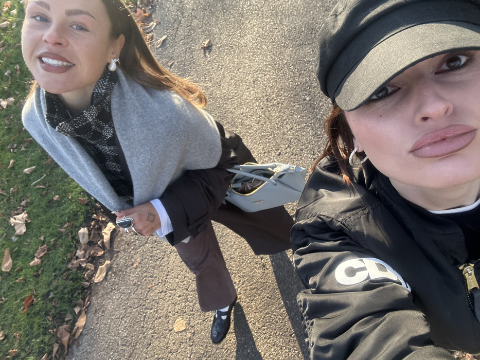 The image depicts two adult females, captured from a high-angle perspective on a paved path within an outdoor public space. The foreground female, presumed to be the photographer, wears a black newsboy cap and a black jacket with a white 'CDG' logo partially visible on the left arm. Her features include dark hair, defined eyebrows, and light-toned lipstick; she wears small hoop earrings. The background female stands smiling, looking directly into the camera. She has long brown hair and is dressed in a light grey oversized sweater, a black and white patterned scarf, a white collared shirt with visible cuffs, dark brown trousers, and black flat shoes with white detailing. A light blue structured handbag hangs from her right arm. Her left hand displays a prominent ring with a dark stone on the index finger and a faded geometric tattoo on the back of the hand. She wears pearl stud earrings. The environment consists of a grey asphalt or paved path, bordered on the left by a grassy area sparsely covered with fallen brown leaves. The lighting suggests warm, possibly late-day, sunlight. The location is a public park or green space within Greater London, United Kingdom.