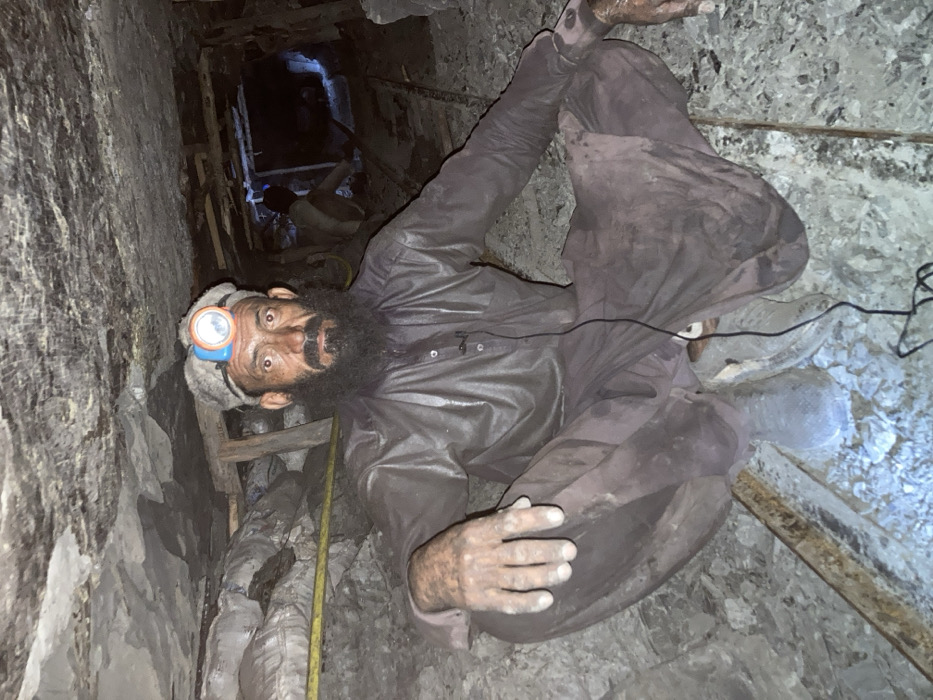 The image depicts a low-ceilinged, rock-walled underground mine shaft in Duki, Pakistan