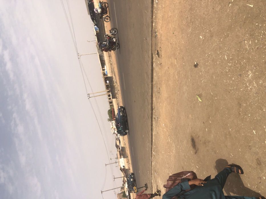 The image displays an outdoor street scene in Kufena, Nigeria, under a hazy, bright sky suggesting daytime