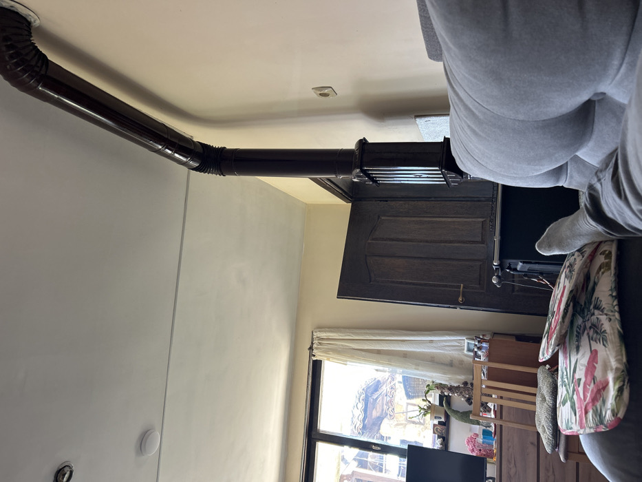 An interior scene is depicted within a residence in Slanchevo, Bulgaria. The vantage point is from a low perspective, indicating a seated or reclined position on a grey upholstered sofa, a portion of which occupies the lower right and central foreground. A person's lower legs and feet, clad in grey trousers and grey socks, are extended onto the sofa. A cushion with a pink, green, and white tropical leaf pattern rests on the sofa to the left of the legs. To the left, a large window provides a view to the exterior, revealing a section of a tiled roof, possibly a porch or adjacent structure, and some autumnal foliage. A cream-colored curtain hangs to the right of the window. Below the window, a wooden chest of drawers or cabinet is partially visible, holding various objects including a dark-screened television, potted plants, decorative items, and framed pictures. A wooden chair with a patterned cushion is positioned in front of this furniture. In the mid-ground, a dark brown, paneled wooden door stands ajar, revealing a darker interior space beyond. To the right of the door is a tall, dark brown metal wood-burning stove with decorative vertical fluting on its upper section and a substantial base. A dark brown metal flue pipe extends vertically from the stove, makes a curved bend towards the right, and then runs diagonally upwards, penetrating the light-colored wall near the ceiling. The walls are painted a light, neutral color. The ceiling is flat and light-colored, featuring a thin, linear trim detail. A recessed light fixture and a circular white smoke detector are visible on the ceiling towards the upper left. A white electrical outlet is present on the right-hand wall. Natural light illuminates the room, suggesting daytime conditions.