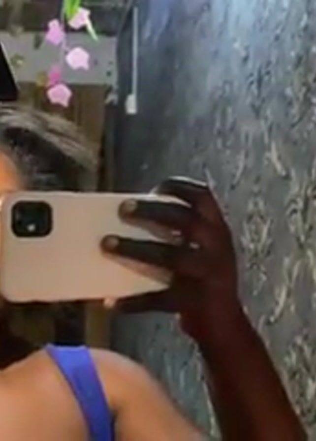 A young woman in a blue tank top is taking a selfie in front of a mirror. She is holding her phone with her right hand, and another person is holding a phone above her head. The woman has straight, dark hair that is sticking out. She is smiling at the camera. The background is a dark patterned wallpaper. There are fake pink flowers and greenery hanging on the wall.