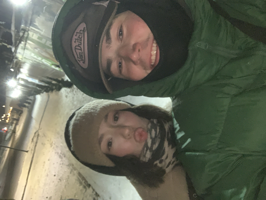 A selfie featuring two individuals in winter attire. The person on top wears a black balaclava, a green hooded jacket, and a cap with "Van Dutch" visible. They smile broadly, showing their teeth. Below, the other person wears a light brown fur hat, a spotted scarf, and makes a kissy face. The backdrop shows a snowy, illuminated street at night with light fixtures visible on the left.