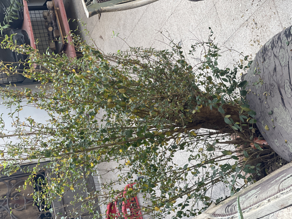 This image depicts an outdoor scene within Sarouja Municipality, Syria. The central subject is a multi-stemmed, leafy shrub or small tree, exhibiting green and yellowish-green foliage with some visible leaf discoloration. The plant is situated within a dark, textured, circular base, possibly a tire or a weathered planter, which is partially visible at the bottom center. The immediate ground surface is a light-colored paved area, likely concrete or tiles, with scattered dry leaves. To the bottom left, a portion of a light-colored wooden object with visible carved or textured patterns is present. To the bottom right, a segment of a light-colored, possibly metallic, chair frame with a weathered appearance is visible. In the background, on the left, a dark-colored metal gate or decorative railing with intricate scrollwork is partially observable, behind which a red object, possibly a crate or trolley, can be seen. On the right background, a red-framed shelving unit with black shelves holds various items, including what appears to be stacked firewood or small logs on a lower shelf and dark bags on the top shelf. The background also includes a plain, light-colored wall or building exterior. No individuals are visible in the scene, and no discernible actions or interactions are occurring.