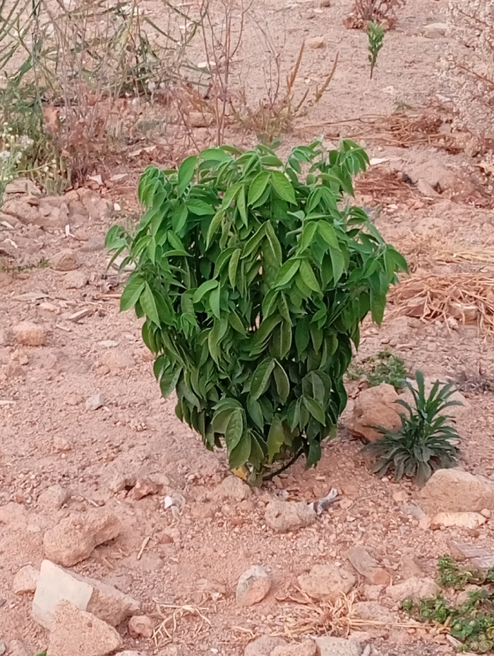The image displays an outdoor scene in Jos, Nigeria, featuring a prominent, verdant green, bushy plant centrally located. The plant, approximately 0.5 to 1 meter tall, has dense foliage composed of numerous ovate leaves. The ground consists of reddish-brown, dry, rocky soil with scattered small to medium-sized rocks and pebbles. In the mid-ground, to the right of the main plant, a smaller, dark green, low-growing plant is visible. The background reveals sparse, dry, light brown vegetation and additional bare patches of reddish earth. Small pieces of white debris and dried plant matter are present on the soil surface near the base of the central plant. No individuals are depicted, and no specific actions or interactions are occurring.