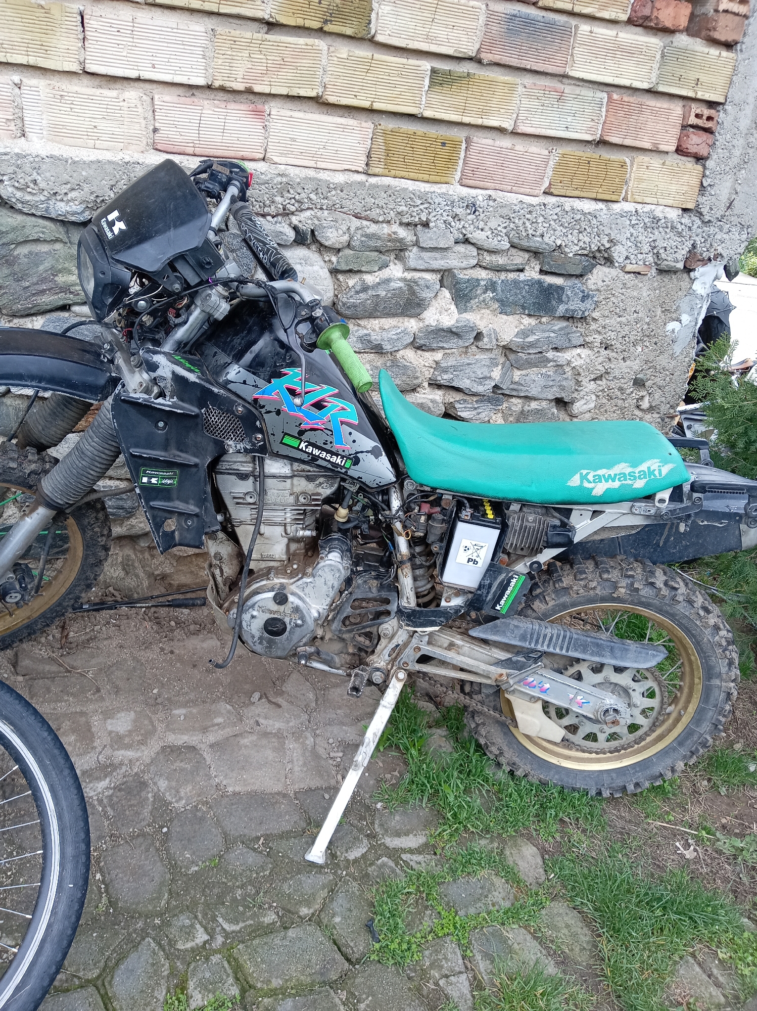 A Kawasaki motorcycle, showing signs of disuse and wear, is situated outdoors against a backdrop of a partly dilapidated wall. The wall's lower portion is constructed of rough stones, while the upper part is made of weathered, light-colored bricks. The motorcycle is predominantly black and gray, with a green seat and Kawasaki branding visible. Its tires are mud-caked, and parts appear corroded. To the left, a bicycle tire is partially visible. The ground is a mix of dirt, stone pavement, and patches of grass. The location is Vetren Dol, Bulgaria.