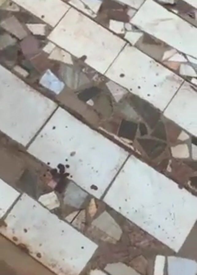 The camera looks down on a patio or outdoor area tiled in an irregular pattern of white and brown tiles separated by rows of inlaid multi-colored stone fragments