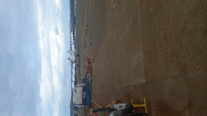 An outdoor scene reveals a vast, flat, brown concrete expanse under a cloudy sky. Several small airplanes are parked in the distance, attended by ground support equipment. In the foreground, a blue and white vehicle with hoses attached is visible, alongside other machinery with yellow stands. The concrete surface is marked with lines and imperfections, suggesting an airfield or industrial area.