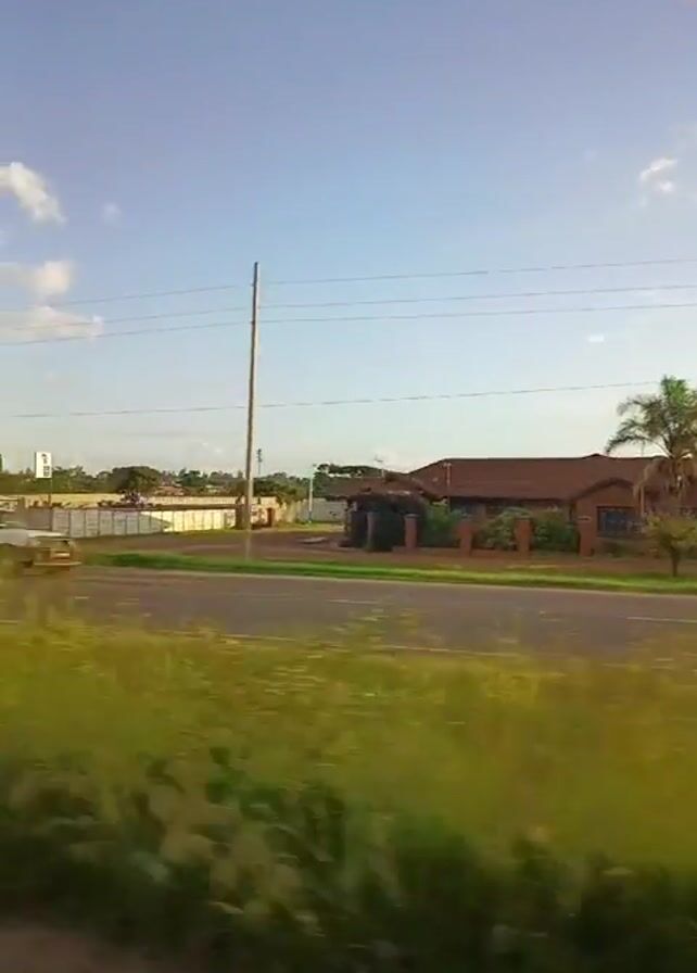 view from inside a moving vehicle, looking out a side window. The scenery consists of a road and some vegetation along the side of the road. There are also buildings and billboards visible in the background. A few cars and a motorcycle pass by on the road. The sky is blue with some white clouds. The general setting appears to be a rural or suburban area, possibly near a factory or industrial complex based on the billboard text that reads "Nspra Factory." There are no people clearly visible within the view of the window of the vehicle.