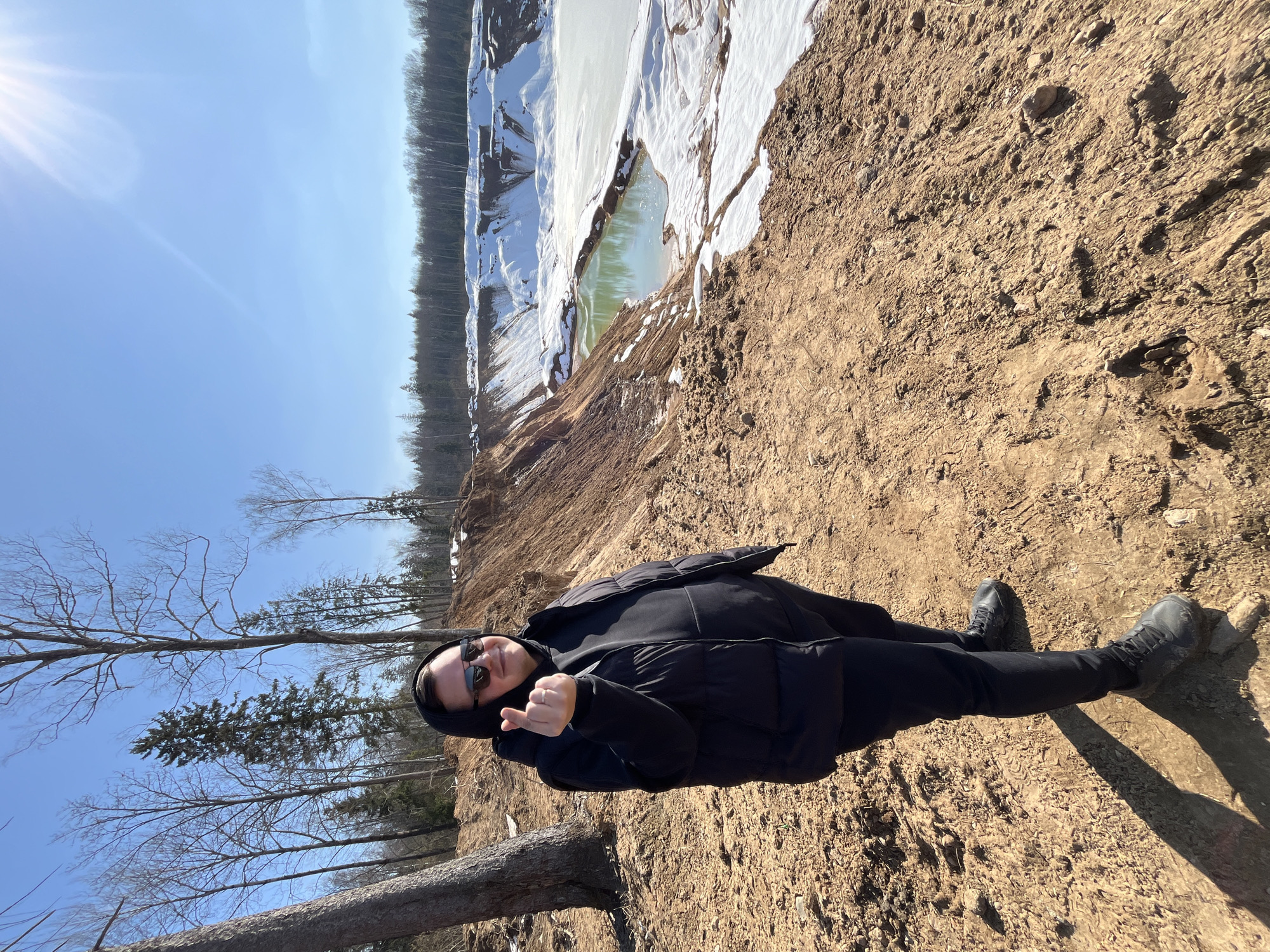 This image, captured in Ivlevo, Russia, presents an outdoor scene under a clear blue sky with a prominent sun flare in the upper right. A single individual, an adult, stands in the left foreground on an elevated, uneven bank of light brown earth. The person is dressed in a black hooded sweatshirt with the hood up, black sunglasses, a black puffy vest, black trousers, and black sneakers. They are positioned facing slightly towards the viewer and to the right, smiling, and performing a "finger heart" gesture with their right hand at chest level. Behind and to the right of the individual lies a large, deep excavation pit, characterized by steep, eroded slopes of exposed brown earth and sand. The bottom of the pit contains a body of water, partially covered by ice sheets and areas of open, greenish-blue water. Significant snow cover is visible along the slopes of the pit and on the ice surface. A dense line of trees, comprising both bare deciduous and evergreen conifers, forms the horizon in the background, bordering the excavation site. The ground in the immediate foreground is rugged and uneven, casting shadows from the sun.