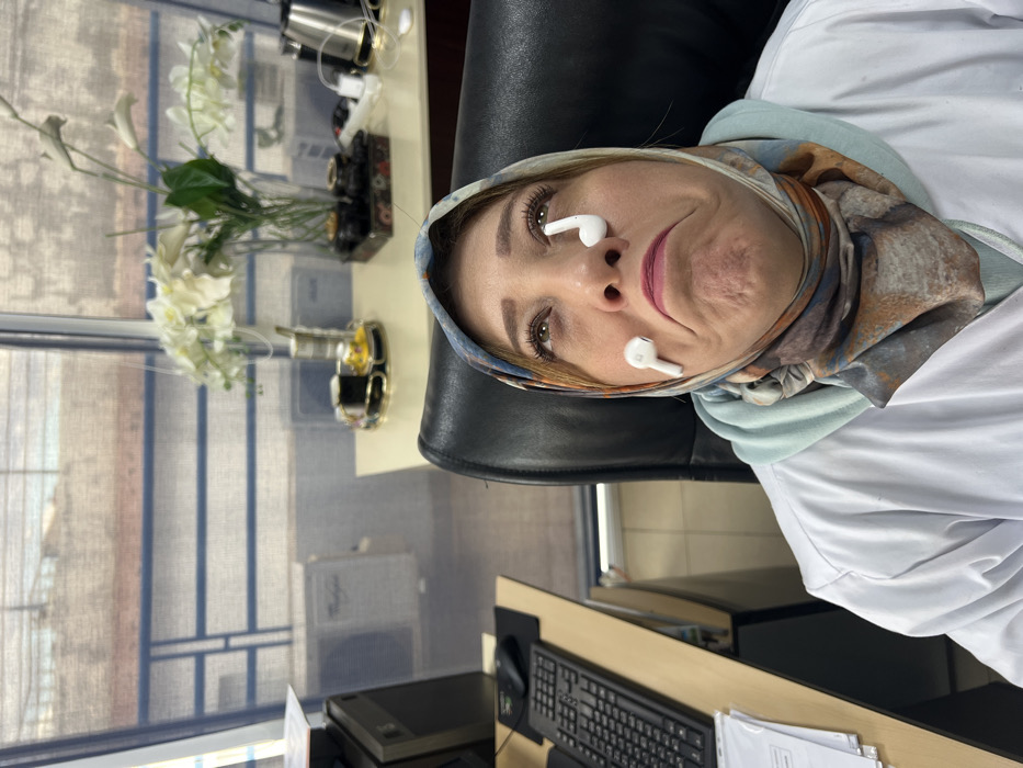 This image depicts an interior office scene in Meknes, Morocco. An adult female subject, wearing a white lab coat, a light blue undergarment, and a multi-patterned hijab, is seated in a black office chair. Her face displays an exaggerated sad expression with upturned eyes and a downturned mouth. Two white wireless earbuds are positioned on her face: one rests on her left cheek below the eye, and the other on the bridge of her nose below her right eye, simulating tears. To her left, a light-colored desk holds a black computer keyboard, mouse, monitor, and a stack of white documents. Behind the subject, a second light-colored desk contains a clear glass vase with white artificial flowers (orchids and calla lilies), a black decorative tray with small cups, a gold-rimmed tray with similar cups, an electric kettle, and charging cables. The background features a large window with horizontal blue blinds, revealing an exterior view of building structures and a "Whirlpool" branded outdoor air conditioning unit. The precise location within Meknes is not discernible from the image.