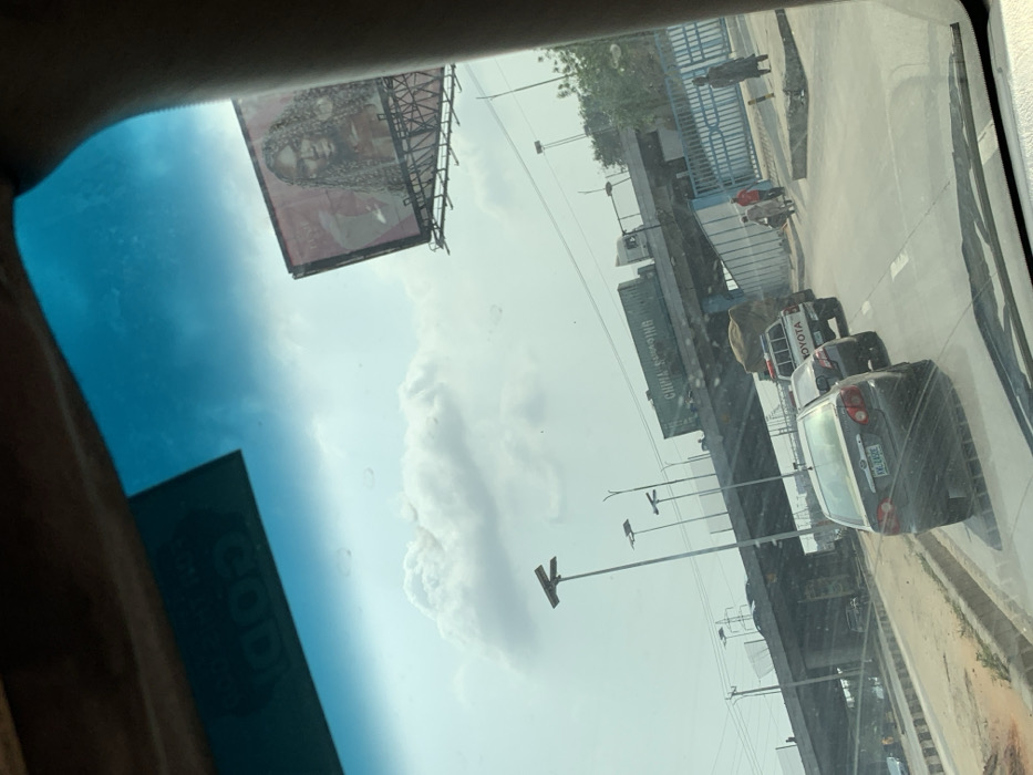 From a vehicle, the scene captures an urban environment with bustling traffic. A billboard featuring a woman's portrait is visible in the sky. Beneath, a cloud formation hovers above a highway overpass. Cars, including a Toyota truck and a black sedan, navigate the road. Container trucks and pedestrians are also present, suggesting a busy thoroughfare in what appears to be an industrial area.