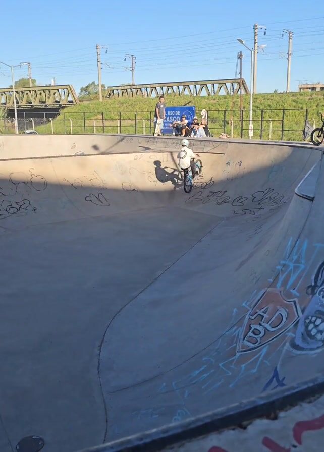 young person riding a BMX bike in a concrete skatepark bowl. The rider is wearing a helmet and light-colored clothing. The bowl is covered in graffiti. Several people are watching from a ledge, including a skateboarder. There's a sign in the background that says "USO DE CASCO". Overhead power lines and a metal bridge are visible. The sky is clear and blue.