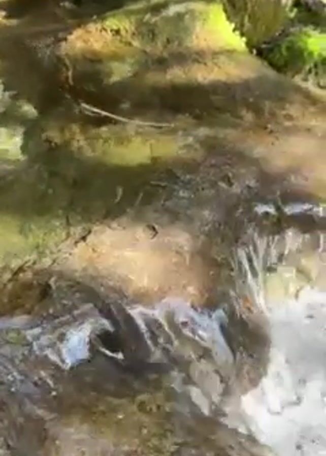 small waterfall flowing over rocks covered in moss. The water is clear and rushes downward in small steps, creating a splashing effect. Sunlight dapples the scene, illuminating the moss and water.
