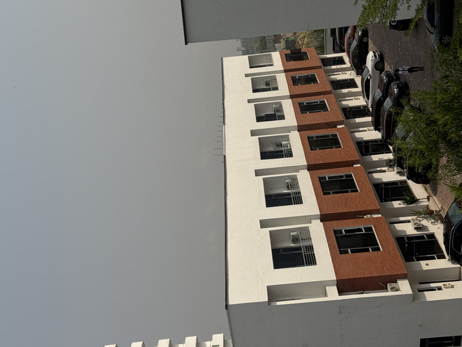 An elevated, downward-angled view captures an urban scene in Ojomu, Nigeria, under a hazy, light gray sky. The central subject is a multi-story building featuring a white upper facade and a reddish-brown lower facade, divided into multiple units. Each upper unit displays a balcony with silver metal railings, containing an exterior air conditioning unit. Below these, the reddish-brown section features dark-paned rectangular windows. The ground floor of the building also shows dark windows and doorways, with air conditioning units mounted below some windows. Potted plants are visible near several ground-level entrances. A paved parking lot, appearing to be made of interlocking bricks, occupies the foreground and midground in front of the building. Numerous vehicles are parked, including multiple dark-colored sedans and SUVs, and a few lighter-colored cars. One male individual, dressed in a light shirt and dark trousers, is walking right-to-left across the paved parking area towards the building. To the far left, a section of a white multi-story building with stacked balconies is partially visible. On the right, a white wall or building corner frames the scene. Distant, indistinct structures are faintly visible on the horizon through the atmospheric haze. Green foliage from trees and bushes partially obscures some parked vehicles in the lower right and left corners of the frame.