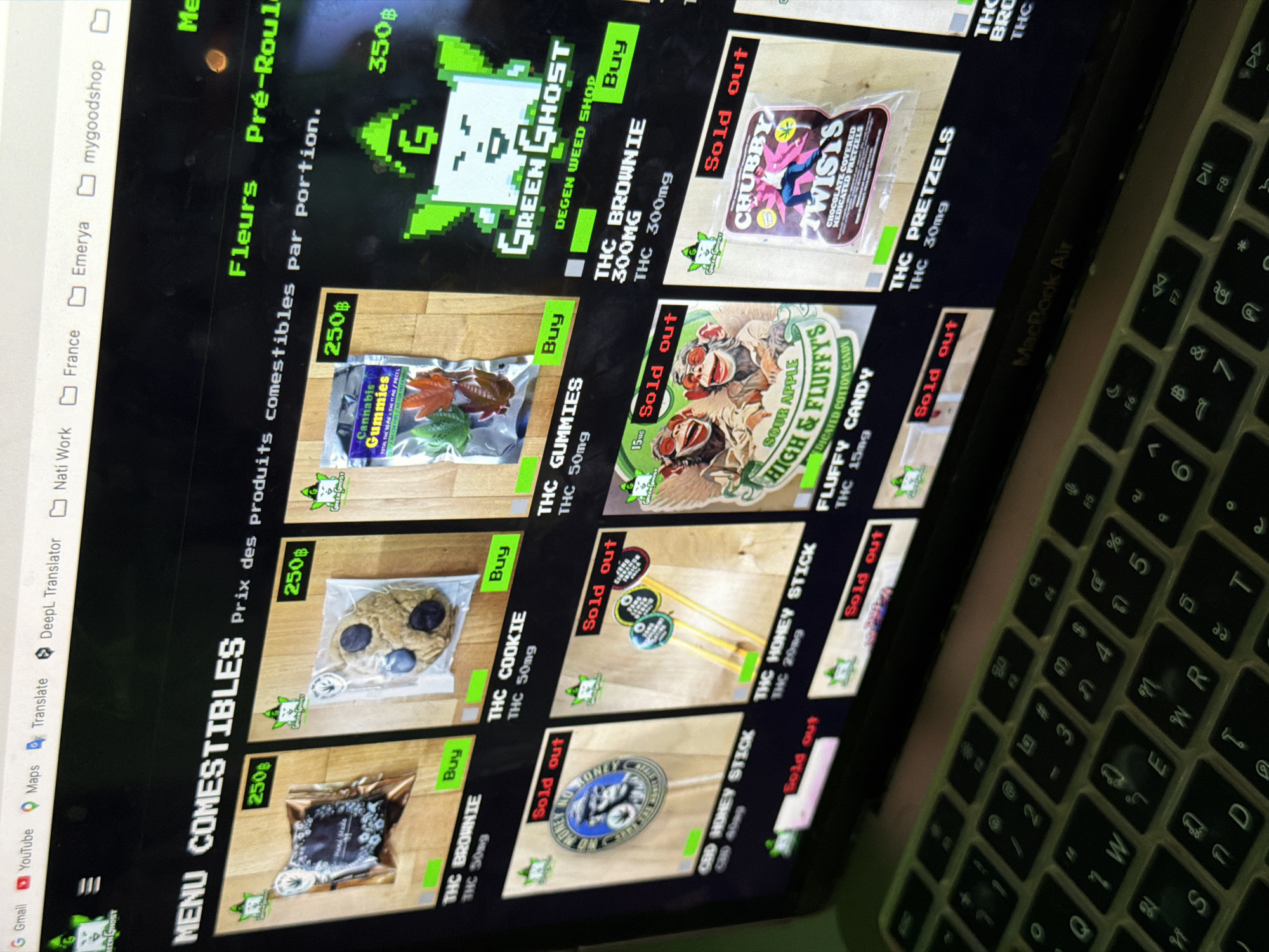 - "The image displays a close-up view of a silver MacBook Air laptop screen, showcasing an online menu for a cannabis dispensary named "GREEN GHOST DEGEN WEED SHOP" by FM-RjPGA3, licensed under CC BY 4.0