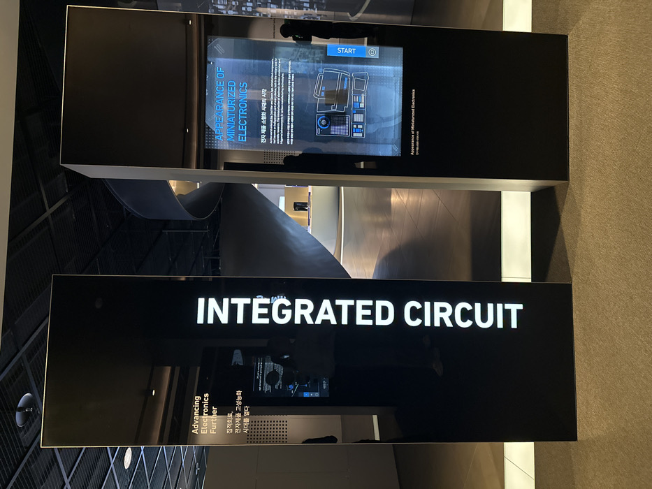 The image depicts an interior view of the Samsung Innovation Museum (S.I.M.) in Suwon-si, South Korea. Two tall, rectangular display panels, finished in a reflective dark material, stand vertically in the foreground on a brown carpeted floor. The left panel prominently displays white vertical text reading "INTEGRATED CIRCUIT." Its highly reflective surface shows partial mirrored text, including "Advancing Electronics Further" and corresponding Korean text, along with a blurred reflection of a human figure's lower body, suggesting light-colored footwear. The right panel features an illuminated digital touchscreen display exhibiting an interface titled "APPEARANCE OF MINIATURIZED ELECTRONICS" with accompanying Korean text. The screen presents diagrams of electronic components and includes a visible "START" button on its right side. A shadowy reflection of another human figure is discernible on this panel's surface. The background reveals a modern exhibition hall characterized by a high, dark ceiling with visible gridwork and utility infrastructure. A large, curved architectural element, possibly a ramp or wall, is prominent in the mid-ground. Ambient lighting illuminates further exhibits and a lighter-colored floor surface beyond the immediate foreground. No direct interactions between individuals and the displays are visible, only reflections.