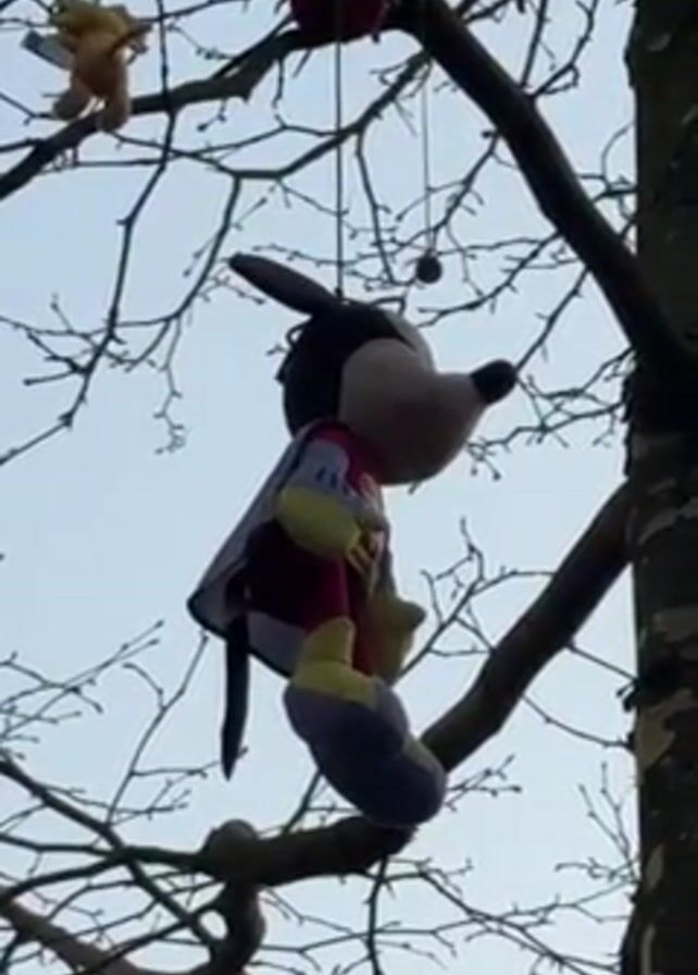 A low-angle shot shows various stuffed toys hanging from the bare branches of a tree against a pale blue sky. The focus is on a Mickey Mouse plush figure dressed in a cape. Other toys are visible in the periphery, including what appears to be a Pooh bear and some red heart-shaped objects. The tree has a textured bark, and the branches are silhouetted against the sky. The overall scene suggests an outdoor setting during the colder months.
