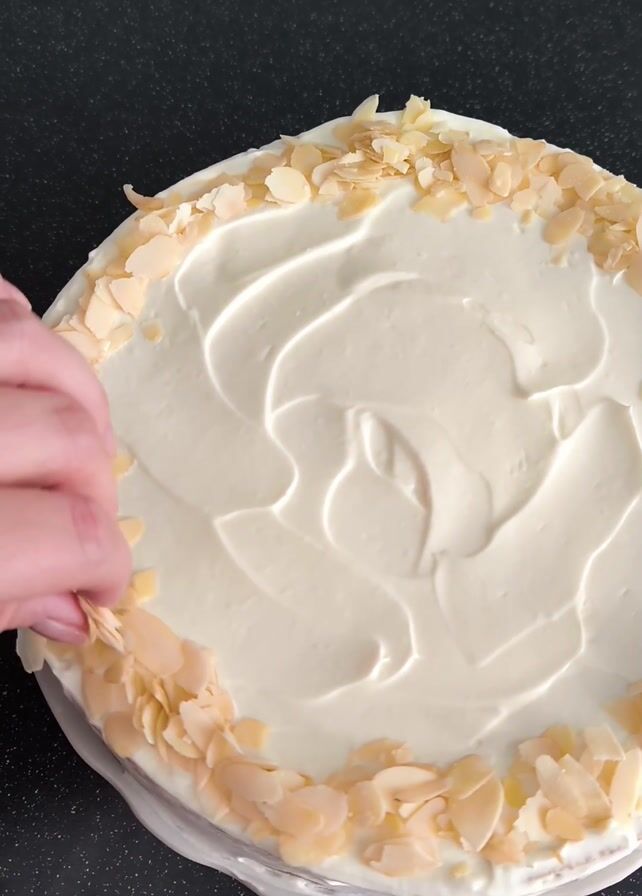 A hand sprinkles toasted almond slivers around the edge of a frosted cake