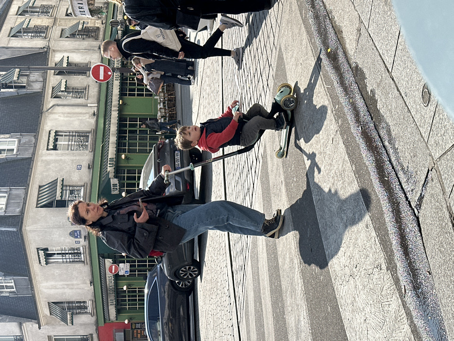 The image depicts a daytime urban street scene in Paris, France, specifically at the intersection near Rue de l'Abbaye in the Saint-Germain-des-Prés district, indicated by a visible "RUE DE L'ABBAYE" street sign on a building facade. In the foreground, a woman, estimated to be an adult, walks across a pedestrian zebra crossing from right to left. She has dark, wavy hair and is dressed in a dark grey jacket, a patterned dark shirt, blue jeans, and dark sneakers. She holds a dark smartphone in her left hand. With her right hand, she appears to guide a light green child's scooter equipped with a seat. A young boy, approximately 2-4 years old, with light brown hair, is seated on the scooter. He wears a red long-sleeved shirt, a dark sleeveless vest, grey trousers, and dark shoes, looking forward and slightly to his right. Both cast distinct long shadows on the sunlit pavement. Behind the central figures, two dark-colored cars are parked or stopped on a cobblestone street. The closer vehicle, a dark grey SUV, displays a French license plate "GG-091-HV". The background is dominated by a multi-story Parisian building featuring a light-colored stone facade, a dark mansard roof, and multiple windows with iron balconies. The ground floor of the corner building houses a commercial establishment with a prominent green facade, large windows, and green striped awnings. Signage on this facade reads "BAR COCKTAILS," "RESTAURANT," and "LA 08." A red circular prohibitory sign (no entry) is affixed to the building above the restaurant entrance. Further in the mid-ground to the right, a man wearing glasses and a dark top, carrying a white tote bag with "FESTINA" printed on it, walks in the same direction as the woman and child. Other indistinct pedestrians are visible further in the background, some near outdoor cafe seating. The overall environment suggests an active city street on a clear, sunny day.