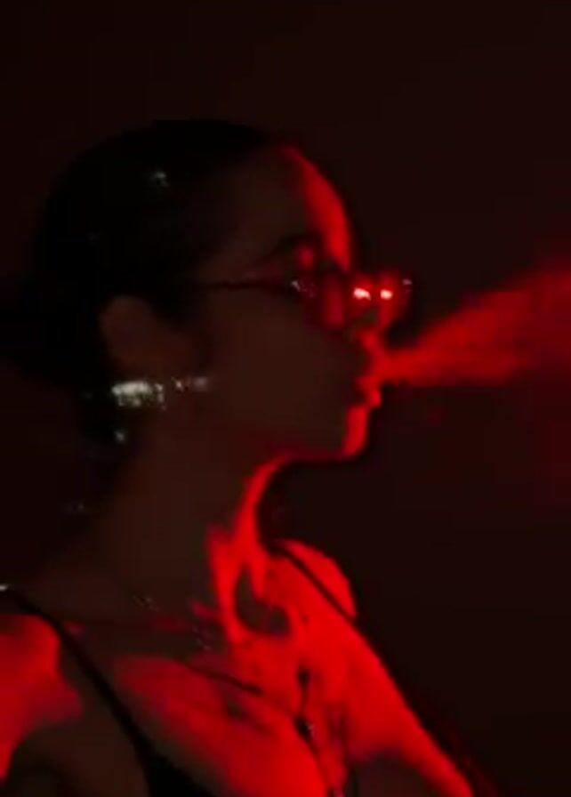 person in profile, illuminated by a red light against a dark background. The person is wearing sunglasses and a low-cut top, with their hair pulled back. They are exhaling a puff of smoke. The person has visible jewelry including hoop earrings and a necklace, as well as a tattoo on their chest.