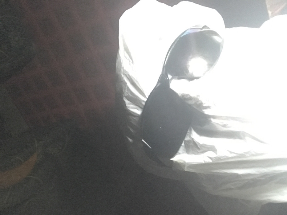 Sunglasses rest atop a crumpled white plastic bag, bathed in bright light that obscures some detail