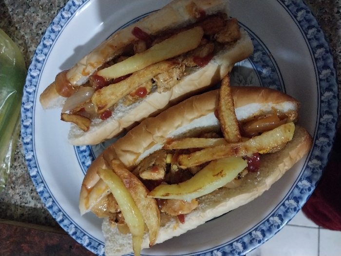 Two oblong bread rolls, split longitudinally, are presented on a white ceramic plate with a blue decorative border. Each roll contains golden-brown french fries, shredded light-colored chicken pieces, and translucent white onion strips. Red sauce, consistent with ketchup, is visibly drizzled over the contents. The plate rests on a speckled grey countertop surface. A dark wooden surface is partially visible to the upper left, and a clear plastic bag containing green vegetables is in the upper background. A tiled floor and a maroon fabric item are partially visible in the lower left. No individuals are present. The location within the city of Unknown, Unknown is not discernible from the image.