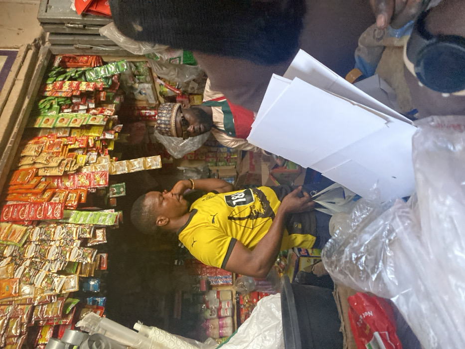 Two men stand within a packed market stall. The stall is overflowing with small, colorful packets of goods. One man wears a yellow Borussia Dortmund jersey while on the phone. The other man, partially obscured by the first man, is wearing a traditional Muslim cap and appears to be watching the other man. The scene is busy and full of diverse products.