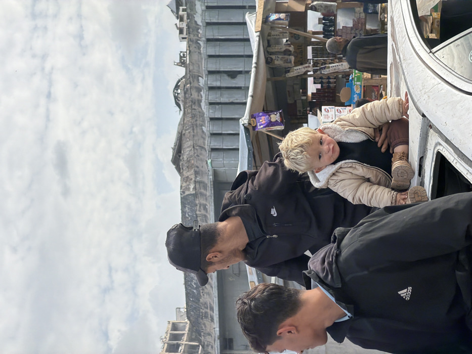 The image captures an outdoor scene in the city of Gaza, Palestinian Territory, beneath an overcast sky. In the foreground, a damaged, light-colored sedan serves as a platform for three individuals. A young child with blonde hair, dressed in a beige padded jacket, dark shirt, brown pants, and brown shoes, sits centrally on the car's rear roof section, facing forward with a pensive expression. To the child's left, a young man with dark hair, wearing a black Adidas jacket, is partially visible in profile, looking left. Behind the child and to the right, another young man, wearing a black baseball cap and a black Nike zip-up jacket, looks towards the right. In the mid-ground on the right, a makeshift market stall with a light-colored tarp roof displays various packaged items, including snacks. An older man, seen from behind, stands near the stall. The background is dominated by multiple heavily damaged multi-story concrete buildings, showing extensive structural collapse and exposed internal elements.