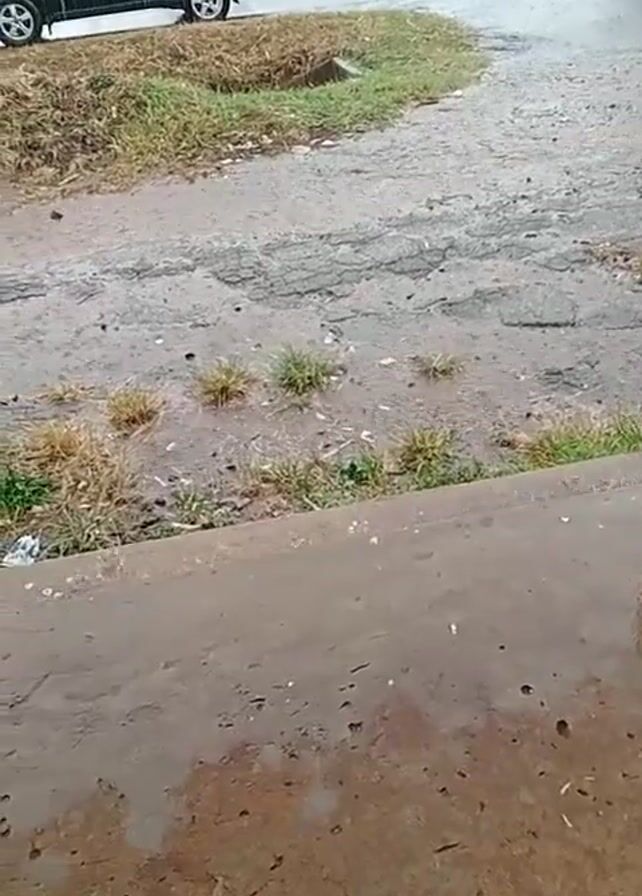 rainy day scene near a road. Rain is falling heavily, creating puddles on the paved surface in the foreground, which appears to be a part of a sidewalk or patio. The road surface is cracked and worn, with patches of grass growing in the gaps. Two cars pass by on the road, a black SUV and a white vehicle. A sign is visible, but the text is not legible. The overall impression is one of dampness and poor weather conditions.