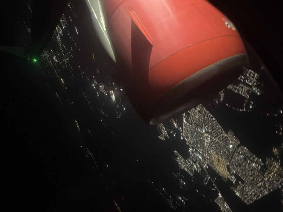 An aerial view at night shows a sprawling city grid illuminated by countless lights. A large, red airplane engine dominates the upper portion of the frame, positioned above the city. A part of a wing with a green light can be spotted in the upper left corner. The scene is dark, emphasizing the contrast between the darkness and the glowing city below.