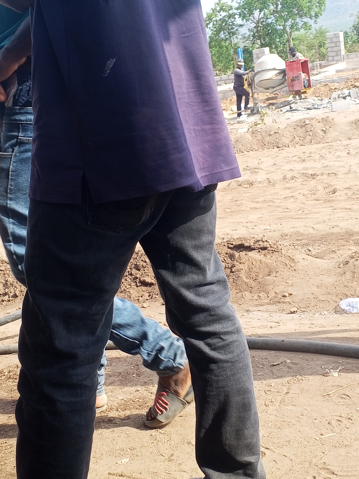 The image depicts an outdoor construction site in the city of Unknown, Unknown, under bright daylight conditions. In the immediate foreground, the back of a person wearing a dark purple polo shirt with a dark stain on the upper left rear and dark grey jeans is visible. To the lower left, the lower legs and feet of another individual are present, wearing light blue jeans and beige sandals with three red stripes. A dark, possibly rubber, hose or pipe lies horizontally across the light brown, sandy ground in the lower midground. Further back on the construction site, two individuals are actively engaged in work. One person, dressed in dark clothing and a light-colored cap, operates a white cement mixer equipped with a red engine housing. Another individual, also in dark attire and a dark cap, stands near the cement mixer. The ground throughout the midground is uneven, consisting of loose soil and sand with small mounds and scattered construction debris, including partially built cinder block walls. The background reveals abundant green trees and foliage, with distant elevated terrain visible.