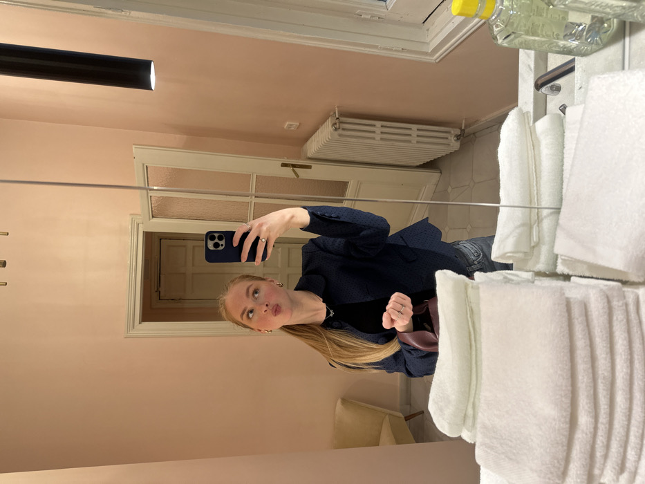 A blonde woman in a navy blazer and jeans takes a mirror selfie in a bathroom. She pouts at the camera, holding a dark blue phone. Stacks of white towels and bathroom supplies are visible on the countertop to the right. The bathroom has pink walls and a white door in the background. A radiator is mounted beneath the ceiling. A chair is visible to the lower left of the image.