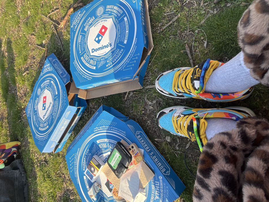 - "The image presents a downward view of a person's lower legs and feet, positioned on a grassy surface amidst three blue Domino's pizza boxes" by FM-fZXFa2, licensed under CC BY 4.0
