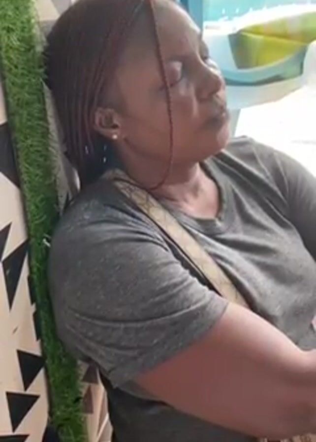 A middle-aged, dark-skinned woman with auburn-colored braided hair leans against a wall with a patterned black and white design. Artificial greenery runs along the edge of the wall. She wears a grey T-shirt and has a tan and beige Gucci bag with a dark brown strap diagonally across her body. She appears to be resting with her eyes closed, then slowly opens them and looks upward, slightly chewing her mouth. The background shows a building with a blue trim and a pool with a white edge.