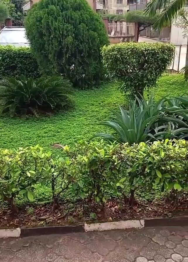 lush, well-maintained garden in an urban setting. The garden features a variety of green plants, including shrubs, ground cover, palm trees, and what appears to be a banana plant. A neatly trimmed hedge borders the garden, and a patterned stone path runs along the edge. In the background, several apartment buildings can be seen, giving context to the location. The video slowly pans from left to right, showcasing the different elements of the garden. The lighting indicates it is likely an overcast day. There are no visible people or animals in the video.