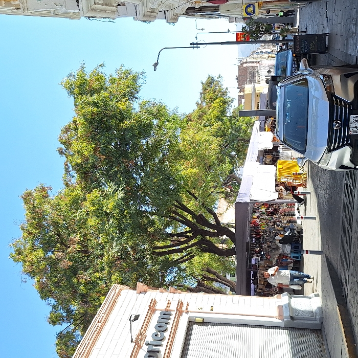 An urban street scene with a large tree dominating the left side. Beneath the tree is a market stall. A light-colored car is parked on the right, its license plate visible. A man stands near the stall. A building with "on" visible on its facade occupies the lower left corner. The street stretches into the distance, lined with buildings. Streetlights are visible above the tree. The sky is clear and blue.