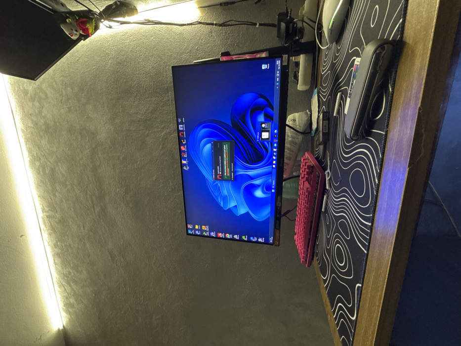 The image depicts an indoor computer workstation located in Silistra, Bulgaria. The environment features a dark grey, textured wall illuminated by a horizontal LED strip light mounted near the ceiling and a vertical light source on the right. A dark brown wooden desk serves as the primary surface. A black flat-panel monitor is centrally positioned on the desk, displaying the Windows 11 operating system with a blue abstract wallpaper. Desktop icons are visible, and a notification pop-up from "gamin.bg" (Discord) is active on the screen. In front of the monitor, a compact mechanical keyboard with vibrant pink keycaps rests on a large black mouse pad adorned with white topographical patterns. A white wireless mouse is situated on the right side of the mouse pad. Behind the monitor on the right, a white multi-outlet power strip is visible, connecting various black cables. A small white plush figure holding a red rose bouquet is attached to the right side of the monitor stand. On the mouse pad, to the right of the keyboard, a dark metallic heated tobacco device is present, alongside a small dark rectangular package and two spent tobacco sticks. A white object, possibly a package or item of clothing, is partially visible behind the keyboard. No individuals are present in the scene, and no direct actions or interactions are depicted.