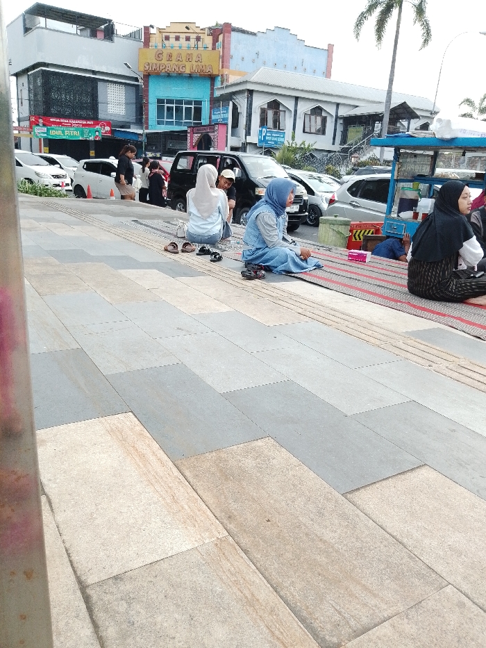 An outdoor, daytime scene in Kecamatan Pati, Indonesia, depicts a multi-level urban environment. In the foreground, a paved pedestrian area features rectangular light gray and beige tiles, with tactile paving strips. Three individuals are seated on this pavement: one female in a light blue hijab and denim-style attire, one female with her back to the camera in a light-colored hijab and jeans, and one female in a black hijab and striped skirt on a red and white striped mat. Multiple pairs of sandals are resting on the pavement near them. Behind these individuals, a male in a white cap and dark shirt is partially visible near a parked black minivan. Beyond the pedestrian area, a street is lined with parked vehicles, including several white, silver, and black cars. An orange traffic cone is visible near a white car. Several other people are standing or walking near the parked vehicles. To the right, a blue food vendor cart is situated near the road. In the background, prominent buildings include a multi-story structure with a yellow "GRAHA SIMPANG LIMA" sign on a blue and grey facade. To its left, another building displays a red banner with "IDUL FITRI." To the right of "GRAHA SIMPANG LIMA" is a white building with arched windows, displaying a "P" for parking sign. Palm trees are visible against an overcast sky.