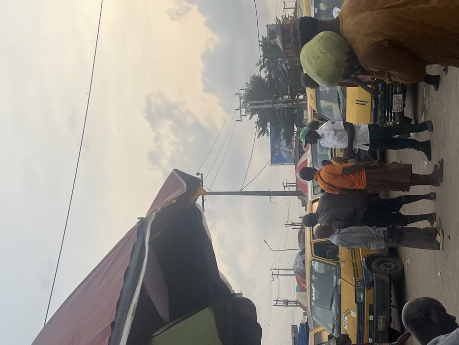 A bustling street scene is captured with a variety of individuals standing on the side of the road near yellow vans. One person balances a watermelon on their head. Utility poles are visible, extending upwards with wires. A large, colorful awning is on the left. The sky is overcast, casting a muted light over the scene. The atmosphere is busy and filled with activity.