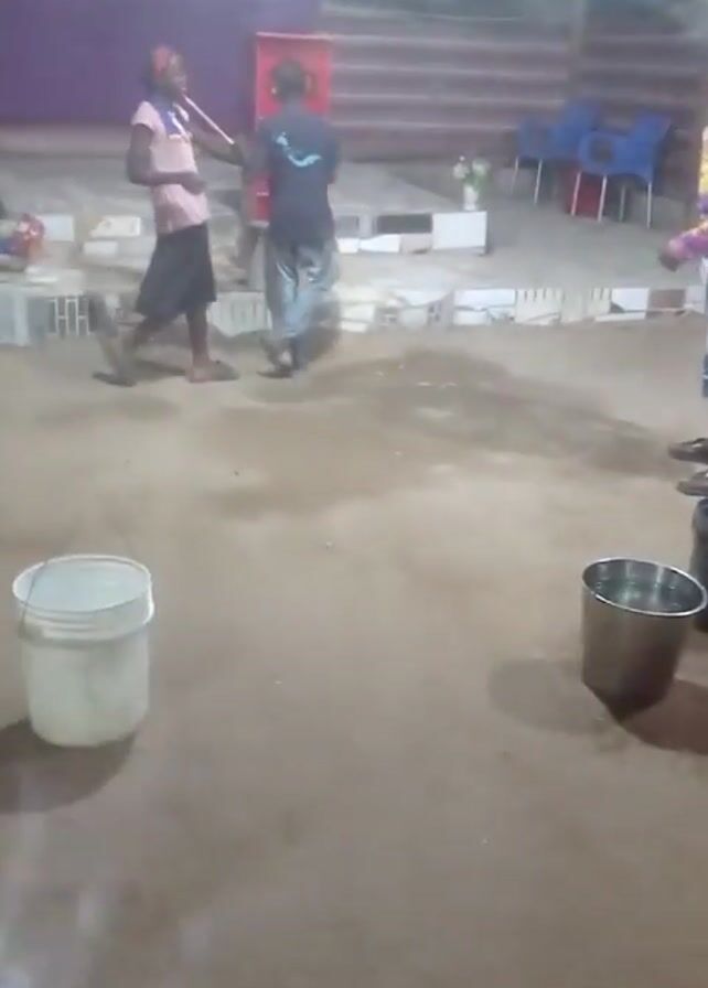 group of people cleaning an outdoor area. Several individuals are visible, including a person in a pink shirt and dark skirt, a person in a gray shirt and jeans, and another person in a patterned shirt and shorts. There are several buckets scattered around the area. One person is using a long object, possibly a stick, to sweep or clean. The area appears to be covered in a light-colored substance, possibly sand or dirt. In the background, there is a structure with a red soda machine, blue chairs, and a sign. The scene is under a partially covered roof with visible lighting fixtures. The camera moves slightly, showing different angles of the cleaning activity.