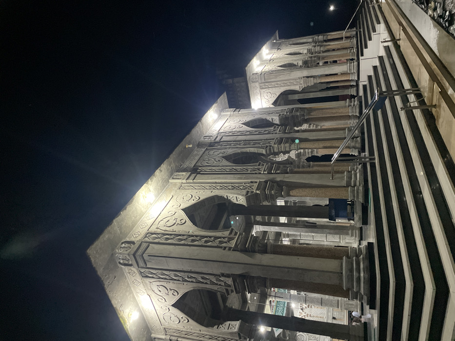 An exterior low-angle view at night depicts a large, illuminated religious structure, likely a mosque, in Cutneuheun, Indonesia. The building features an elaborate architectural style with multiple arches, decorative carvings, and numerous columns constructed from light-colored stone. The façade is characterized by ornate friezes above the arches and patterned pilasters. Warm artificial lights are affixed to the underside of the structure's overhang, casting illumination onto the building's exterior and the surrounding ground. A wide, multi-tiered staircase with alternating black and white treads leads up to the main entrance area on the right side of the frame, accompanied by a silver metal handrail. To the far right, at the base of the steps, a collection of shoes is visible on the ground, suggesting a shoe rack or designated area. Inside the well-lit covered portico, numerous columns support the ceiling. A few individuals, partially obscured, are visible standing or sitting further within the building. A dark blue container or bin is positioned near the base of one column inside the portico. The sky above is dark and clear, indicating nighttime conditions.