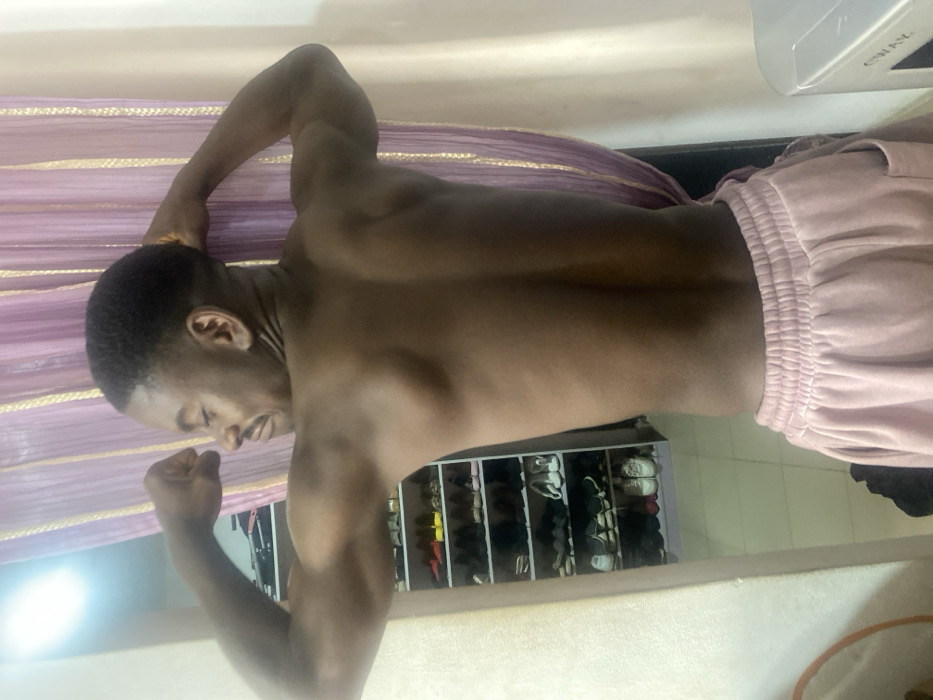An athletic, shirtless man flexes his arm muscles. He wears pink shorts. A lavender and gold striped blanket lies behind him. A shoe rack filled with shoes sits in the background. The photo is taken at a tilted angle.