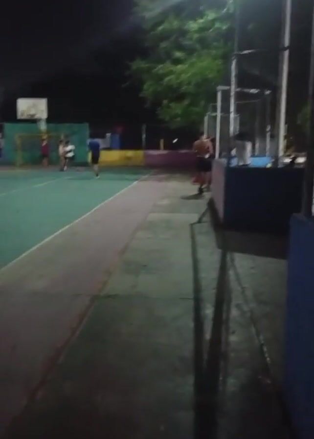 The video depicts a nighttime scene on an outdoor basketball court where a group of people are playing soccer