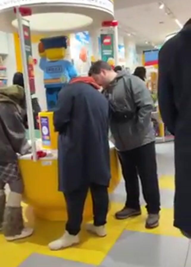 interior of a Lego store. The camera focuses on a "Build Your Own Minifigure" kiosk, which is yellow and circular with a yellow Lego figure dressed as a police officer on top. Three men are standing at the kiosk, looking at the items. One man is wearing a black jacket, grey sweatpants, and white sneakers. Another is wearing a grey jacket, black sweatpants, brown shoes, and a black fanny pack. The third man is wearing a long dark blue coat, black sweatpants, and white sneakers with a red scarf tied around his head. The man in the grey jacket appears to be helping the man in the blue coat make a selection. Other customers walk by.