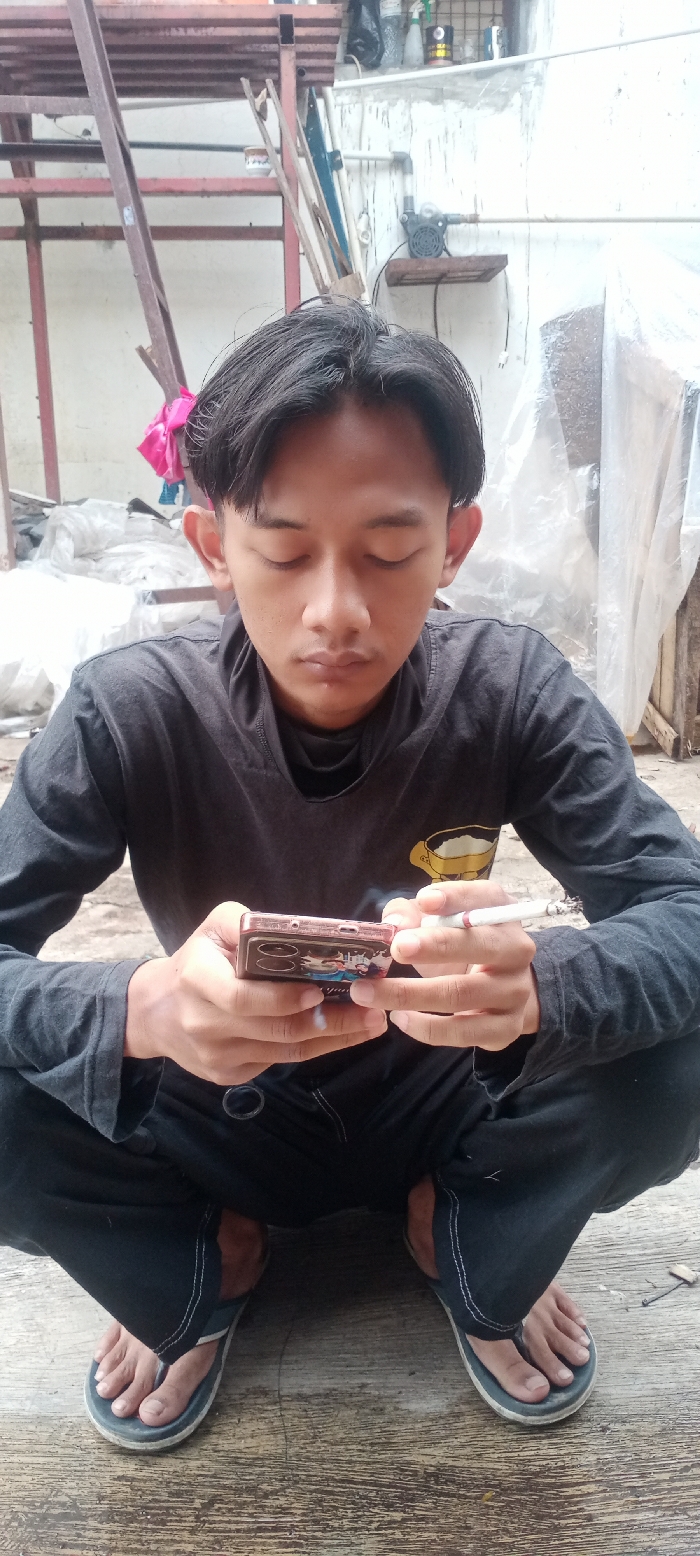 A young male is depicted squatting on a light grey, worn concrete surface in Cilampeni, Indonesia. He has dark hair, closed eyes, and a neutral facial expression. He wears a dark grey long-sleeved shirt with a light yellow graphic of a cup, dark pants with visible white stitching, and dark blue flip-flops. His left hand holds a smartphone encased in a reddish-brown cover featuring a character graphic. His right hand holds a lit cigarette with visible ash between his index and middle fingers, positioned above the smartphone. A metal ring is attached to the left side of his pants. The background consists of a light-colored wall with visible pipes and two wooden shelves. The upper shelf holds a black bag, a spray bottle, and various containers. The lower shelf supports a black electric water pump with exposed wiring and a two-prong plug. To the left, a reddish-brown metal framework is visible, with a pink fabric item draped on it and white plastic sheeting or debris piled on the ground. A large, clear plastic tarp is draped vertically on the right side of the frame.